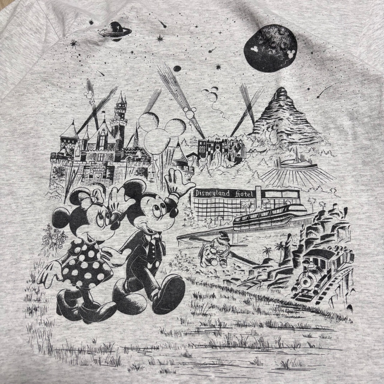 よく見るとミッキーとミニーが、カリフォルニアのディズニーランドにある「トゥモローランド」や「スペース・マウンテン」を背景に歩いている、風景画のようなツラです!