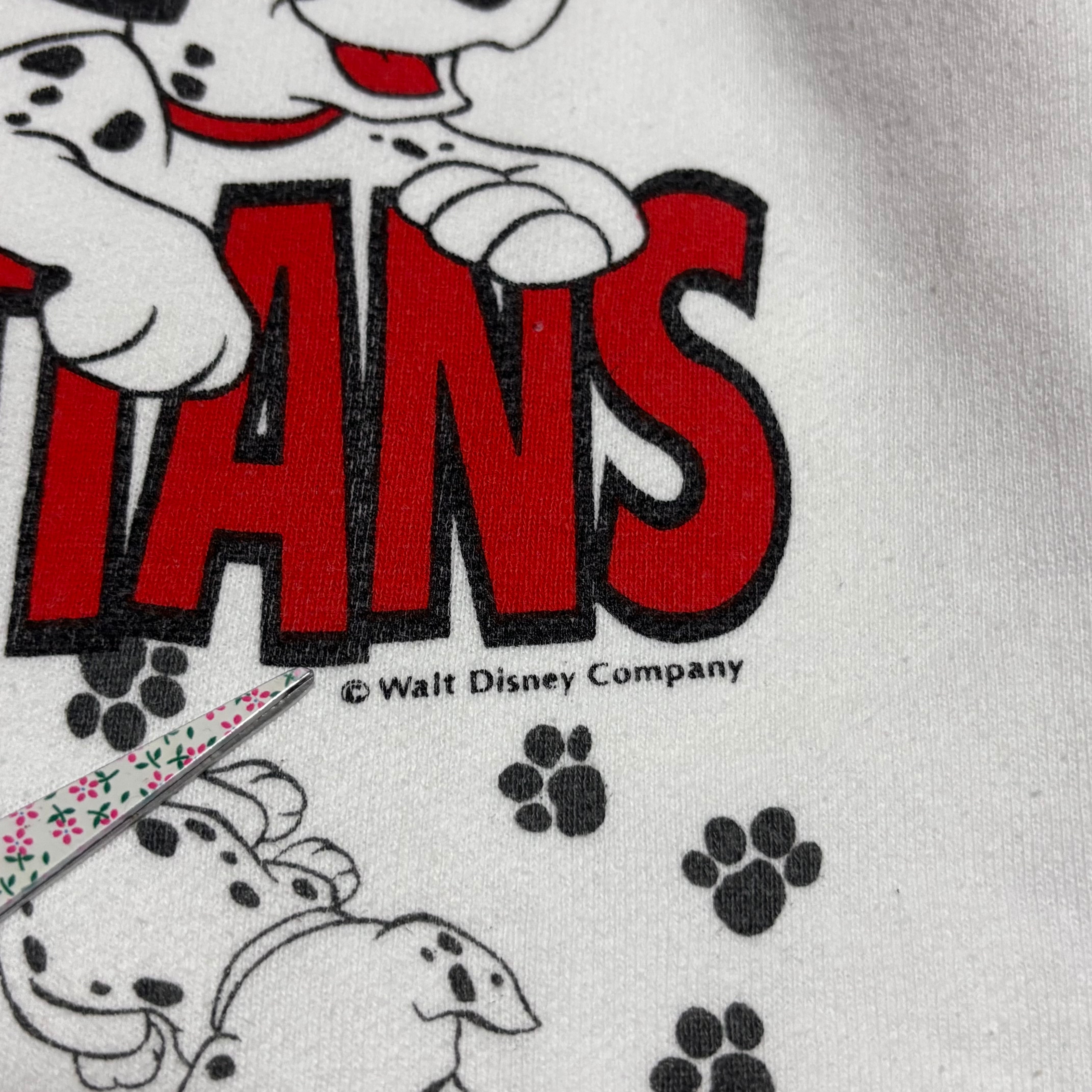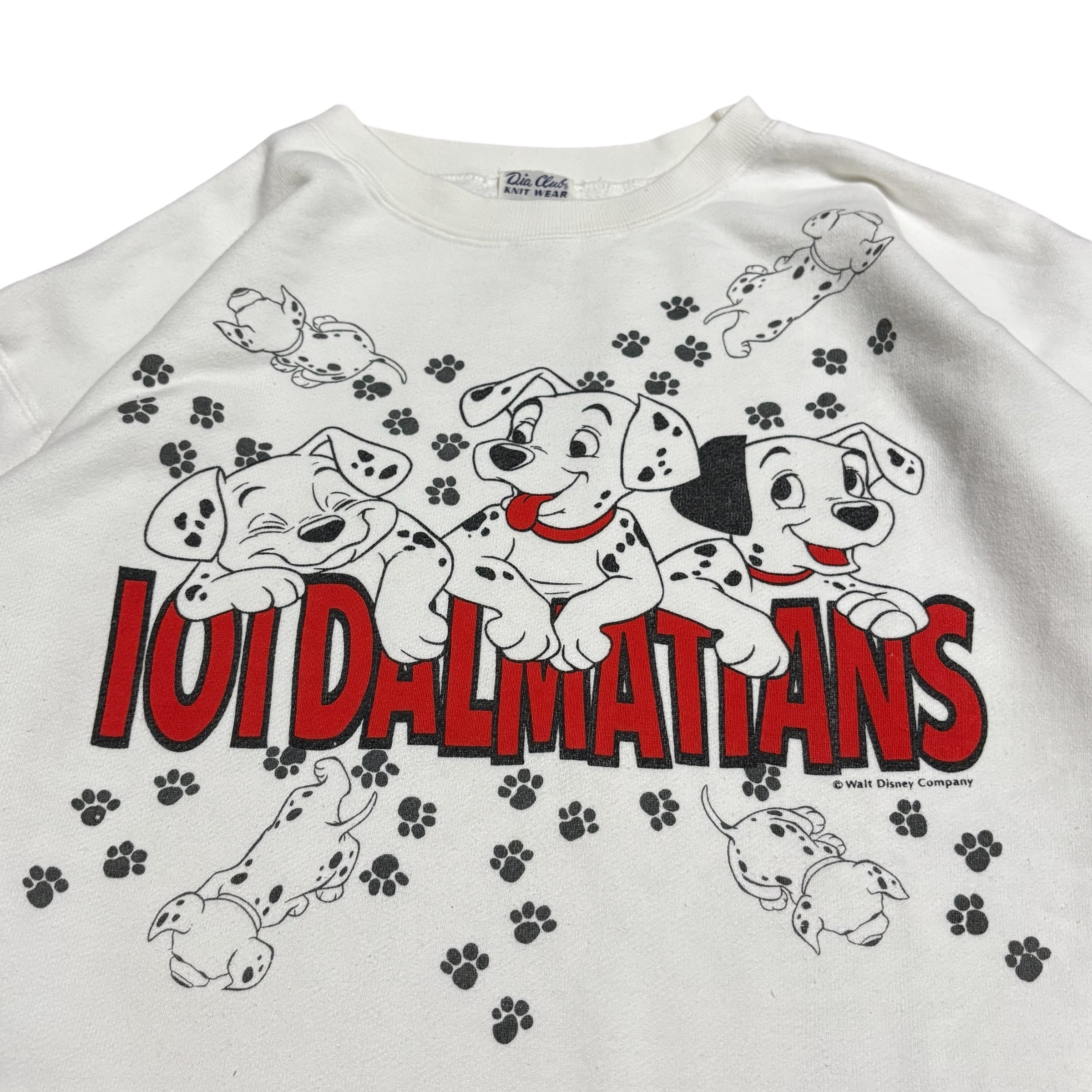 フロントに3匹の子犬と「101 DALMATIANS」のロゴ、そしてその周囲に足跡と子犬がプリントされた最高のプリントです‼️