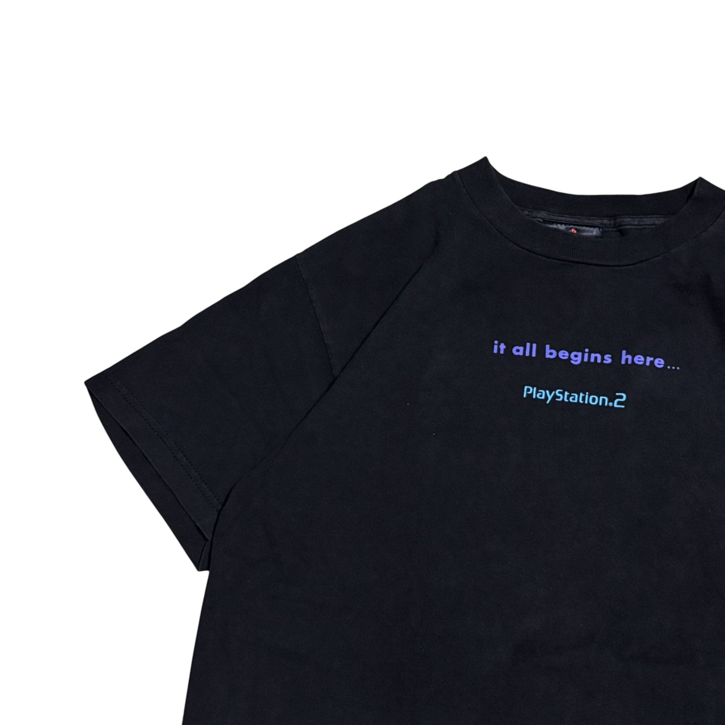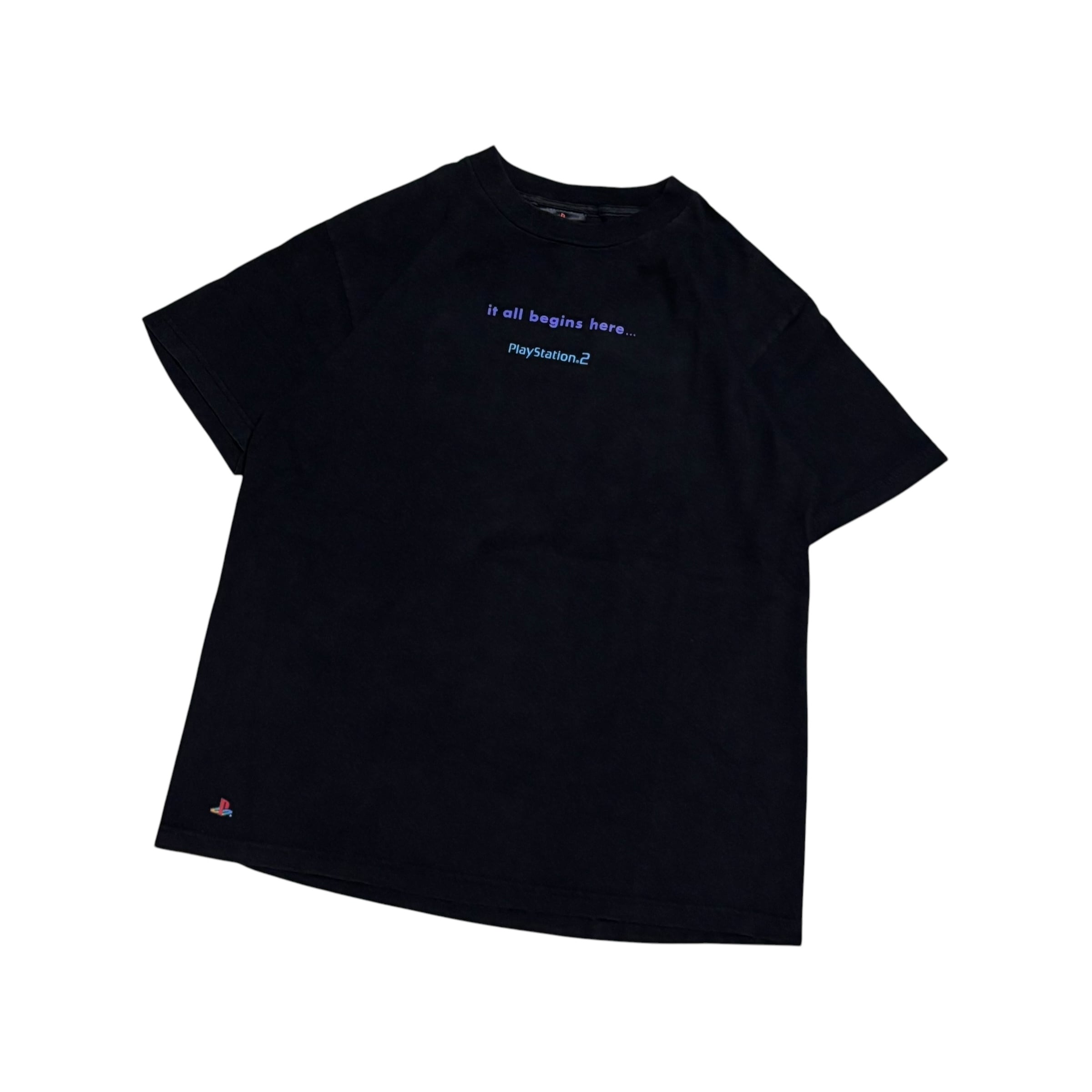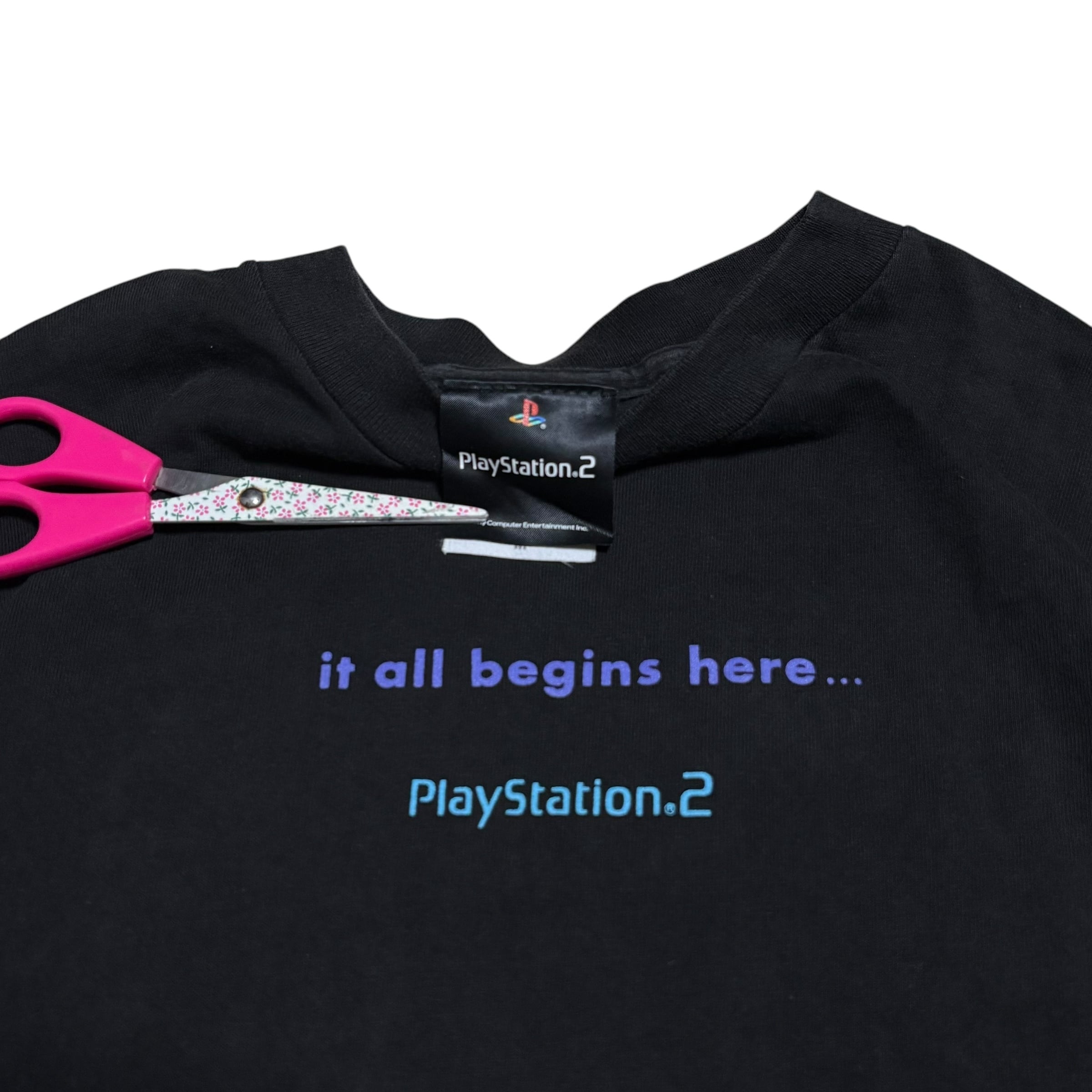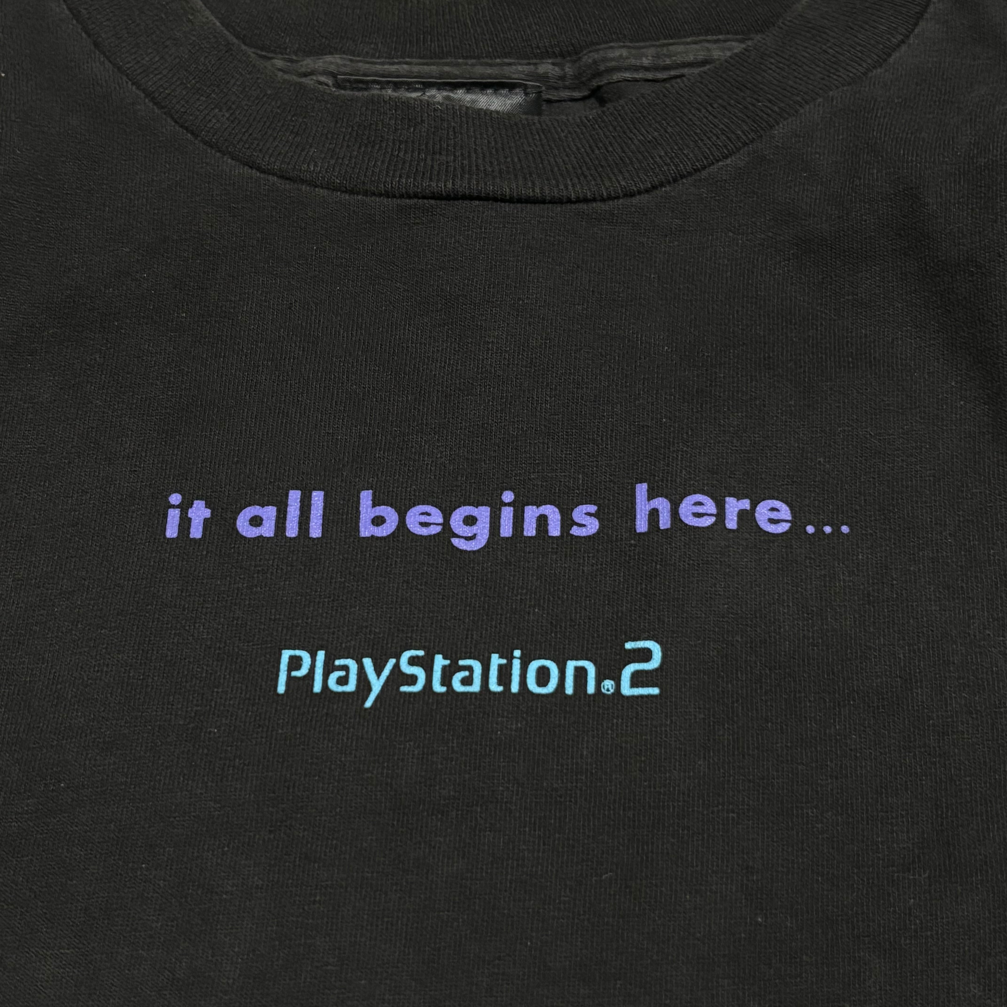 PS2の象徴的なロゴとともに、当時のキャッチコピーである 「it all begins here...」 がプリントされています!