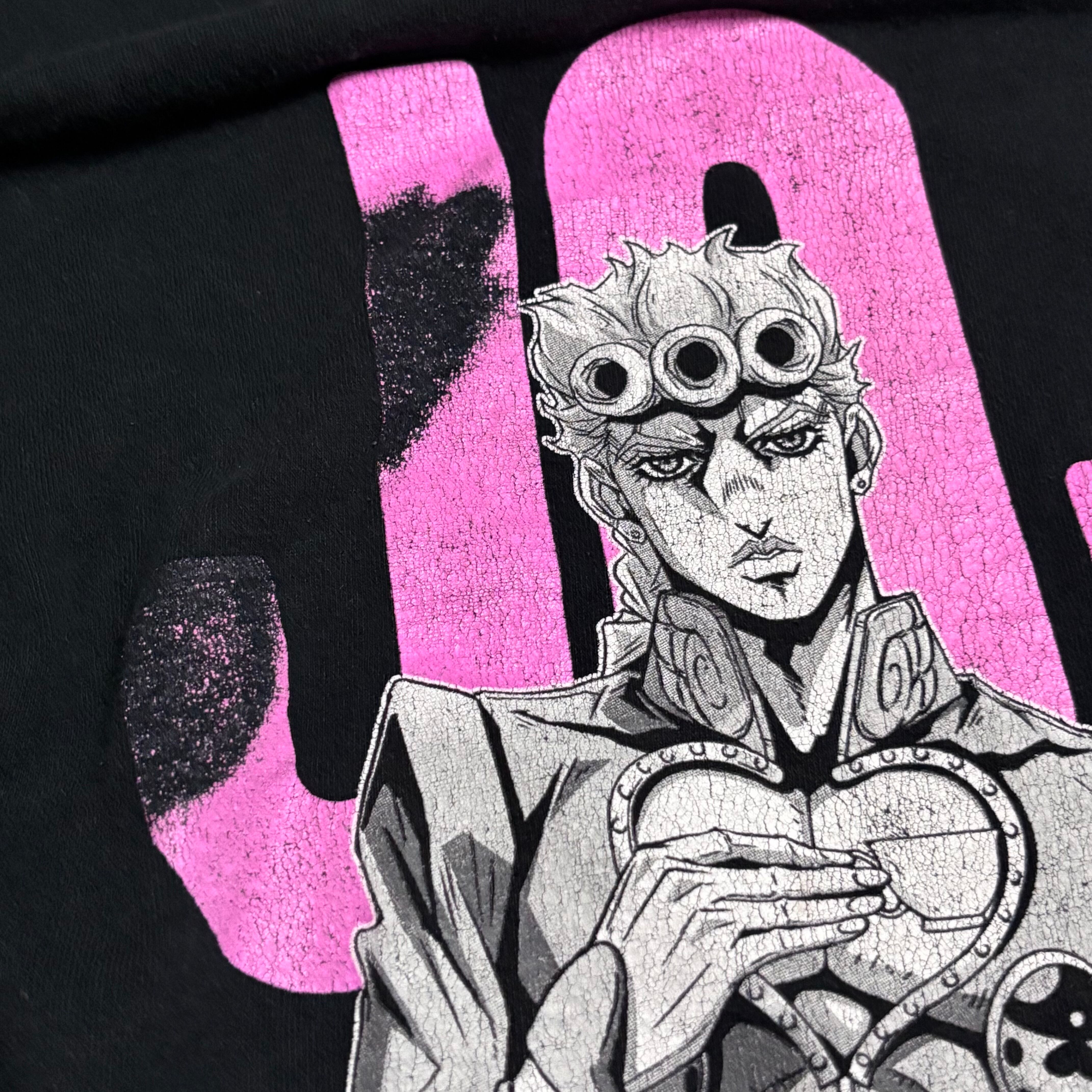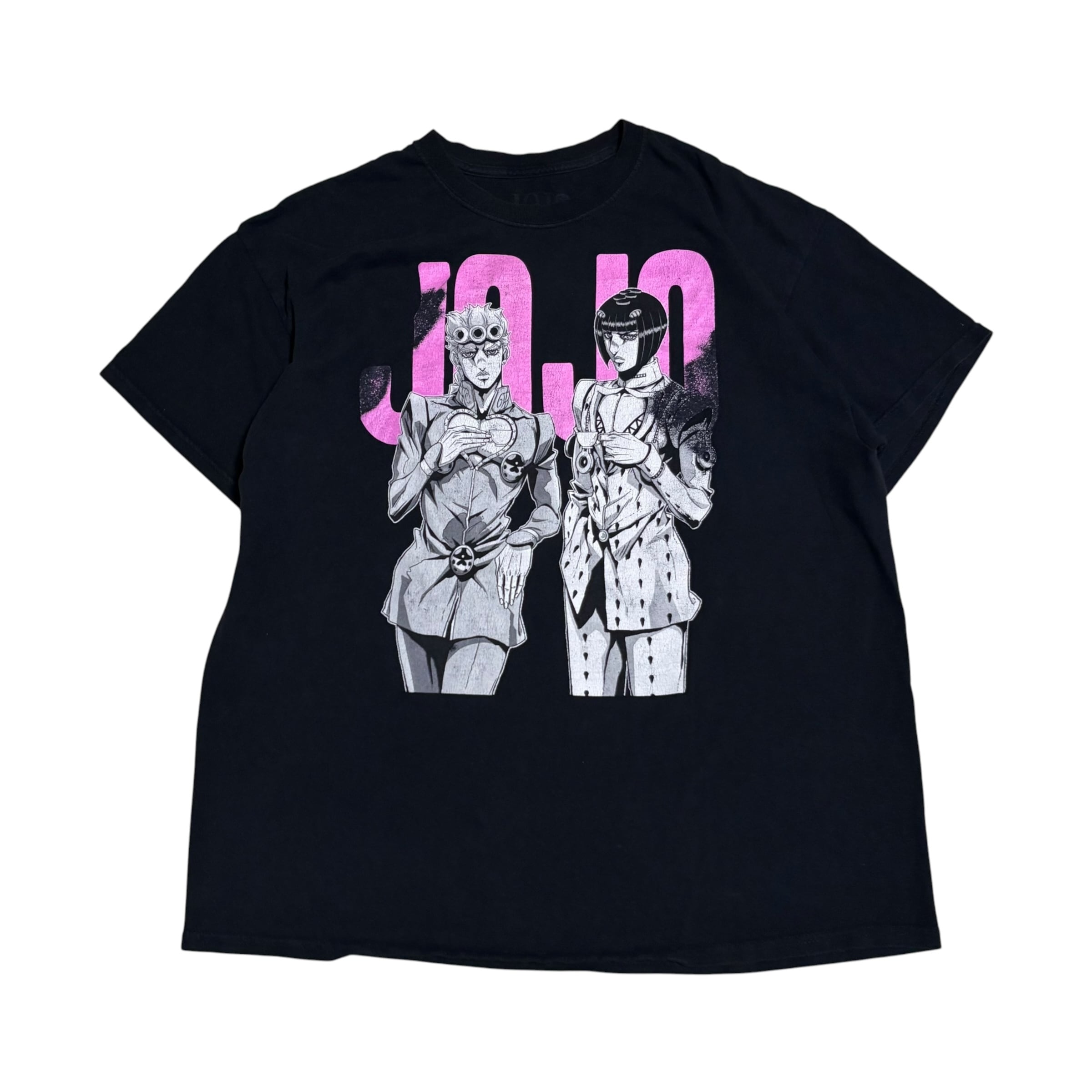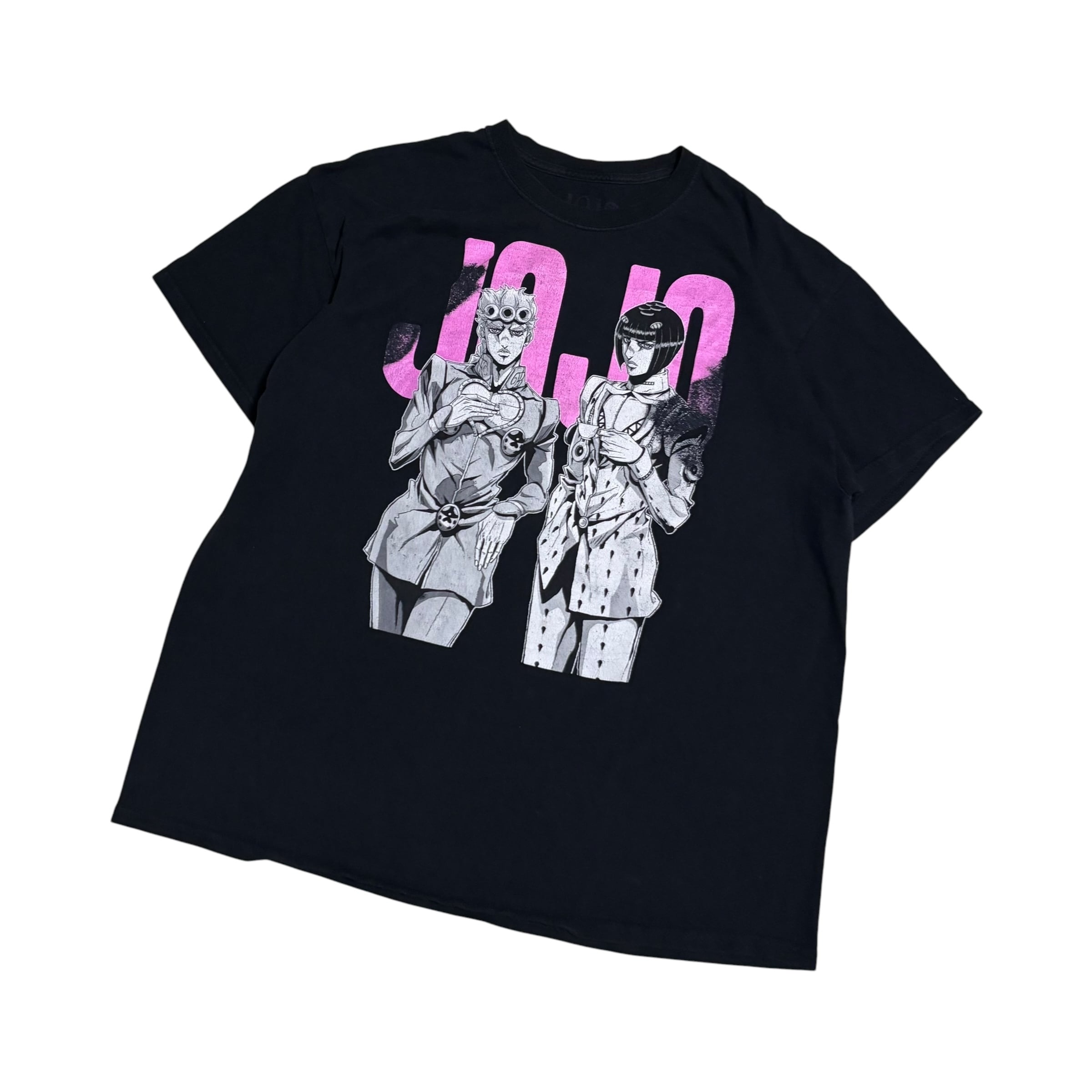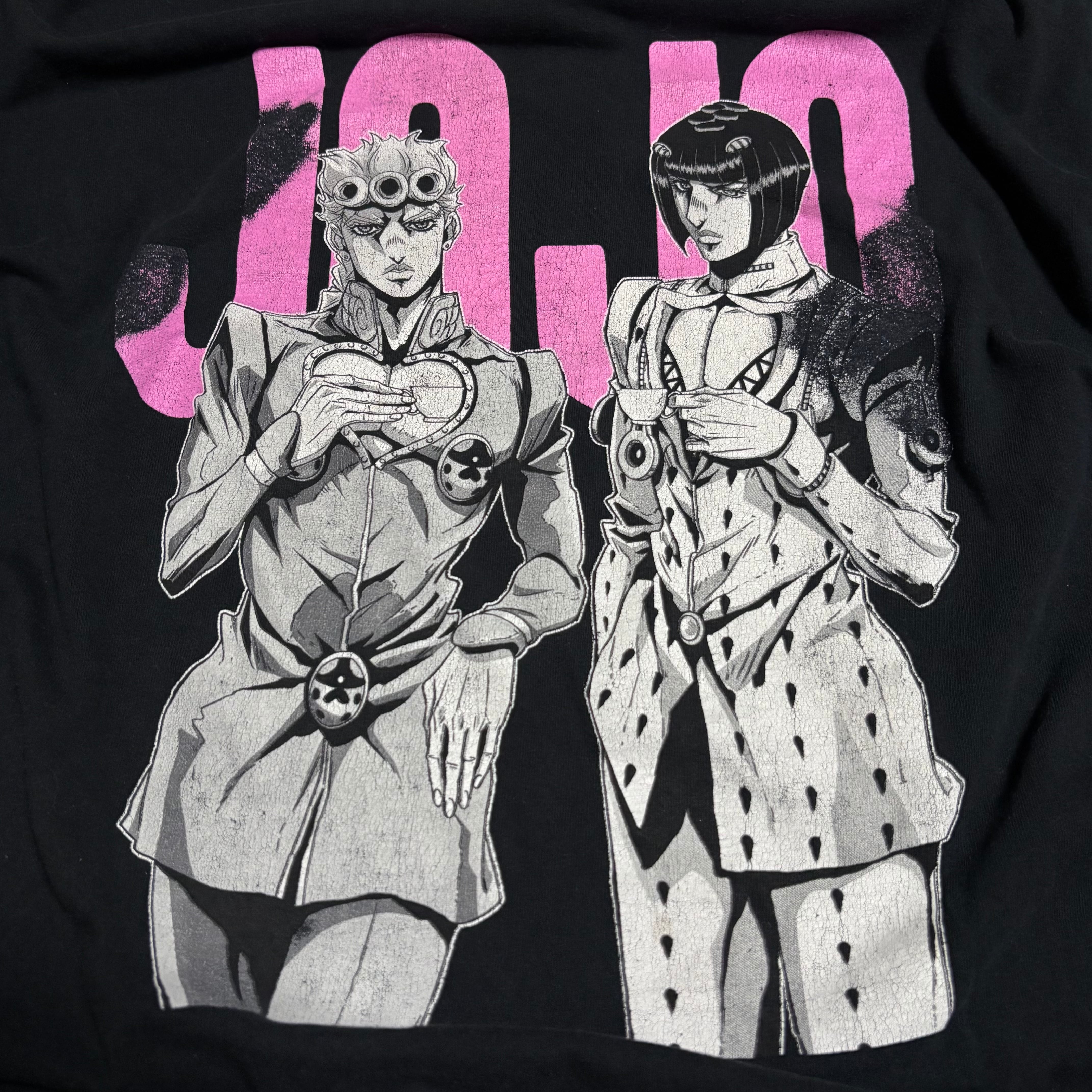 モノクロのキャラクタープリントの背景に、ピンク色で大きく「JOJO」のロゴとプリントされているのが最高です!
